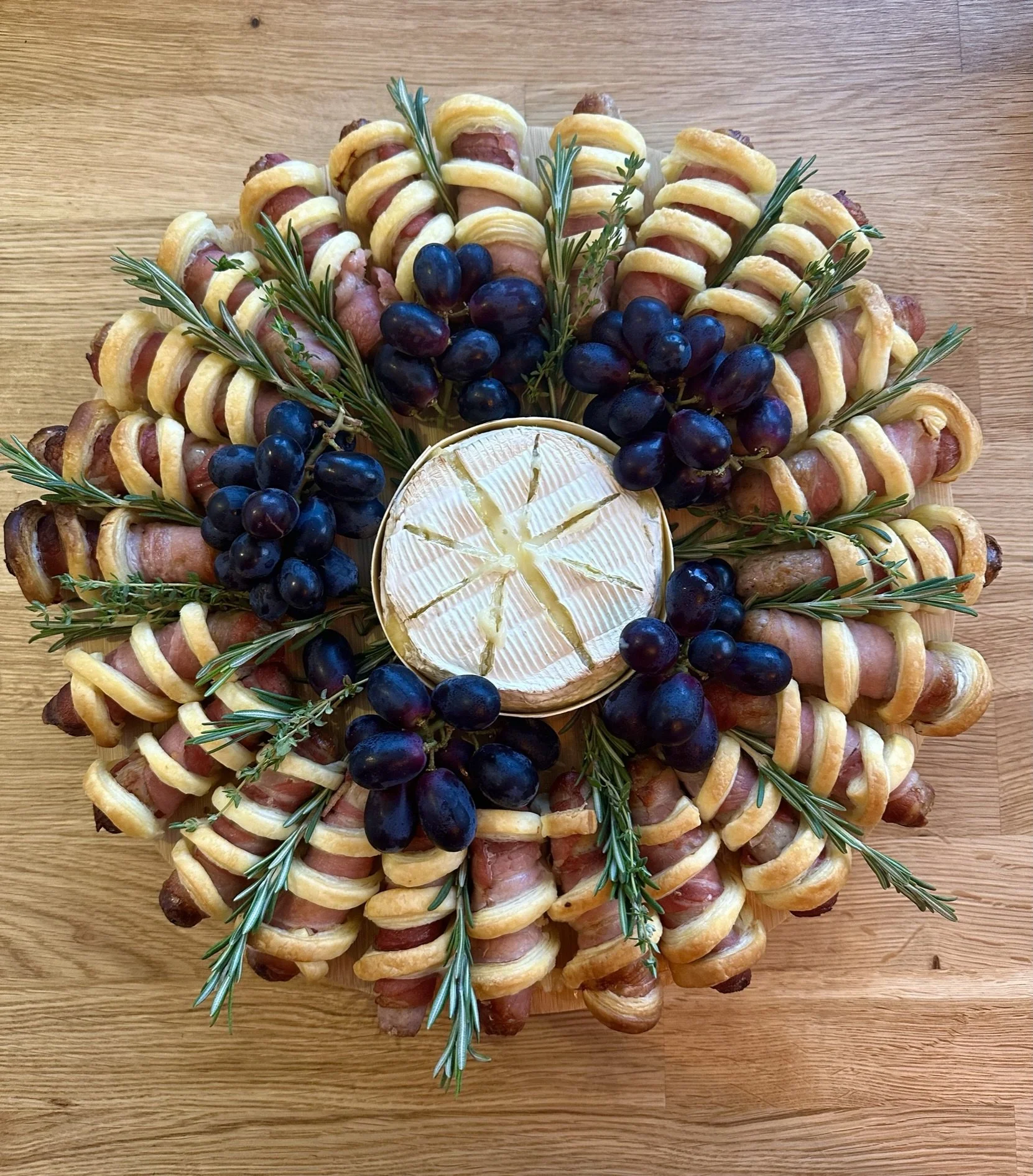 Embrace the festive spirit with a delightful creation that combines the best of sausage rolls and pigs in blankets. This Christmas wreath is a true crowd-pleaser, featuring savoury chipolatas wrapped in crispy bacon and puff pastry, baked to golden perfection. The centre is adorned with a wheel of creamy Brie or Camembert, creating a harmonious blend of flavours. Black grapes and fresh rosemary add a festive touch, making it a visually stunning and delicious centrepiece for your holiday table.