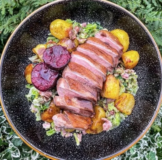 Pan-fried duck, crispy and golden, paired with creamy Savoy cabbage and bacon, enhanced by a touch of cream cheese. Roast new potatoes, golden and crunchy, provide the perfect complement. Drizzled with a spiced plum sauce, this dish is a wonderful blend of savoury and sweet flavours, ready to eat in just 1 hour.